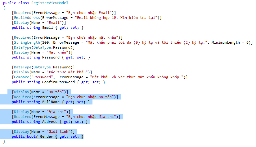 Bước 1: Tìm đến class RegisterViewModel trong file Models/AccountViewModels.cs và bổ sung các lệnh được tô đen